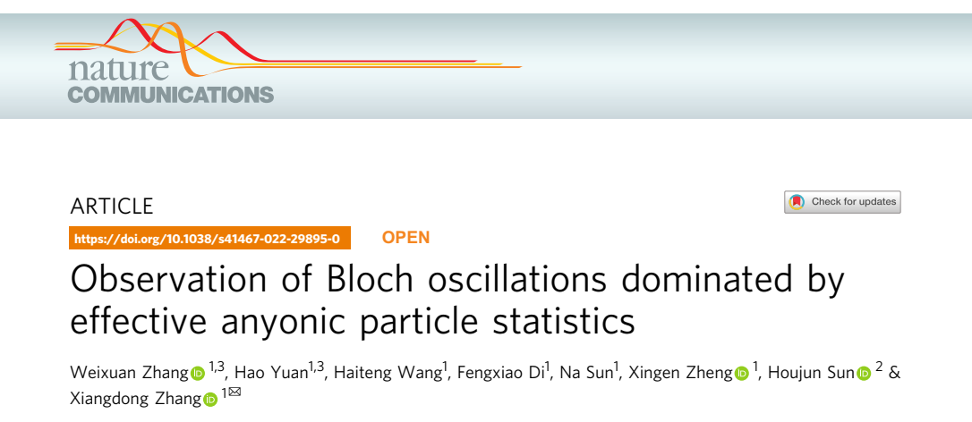 我们知道玻色子遵从玻色统计,费米子遵从费米统计。除了玻色子和费米子,大约四十年前,科学家提出具有介于玻色子和费米子之间统计关系的准粒子,被称为任意子。具体来讲,当交换两个任意子的空间位置时,系统波函数会获得一个介于0到π的相位。科学家研究发现,双体任意子系统可以展现与统计相关的布洛赫振荡行为。虽然理论结果显示赝费米子振荡周期是玻色子的两倍,但处于中间统计角(0<统计角<π)的任意子布洛赫振荡现象还没有被揭示。更重要的是,由于问题的复杂性,有关任意子布洛赫振荡的实验观察还从来没有实现。