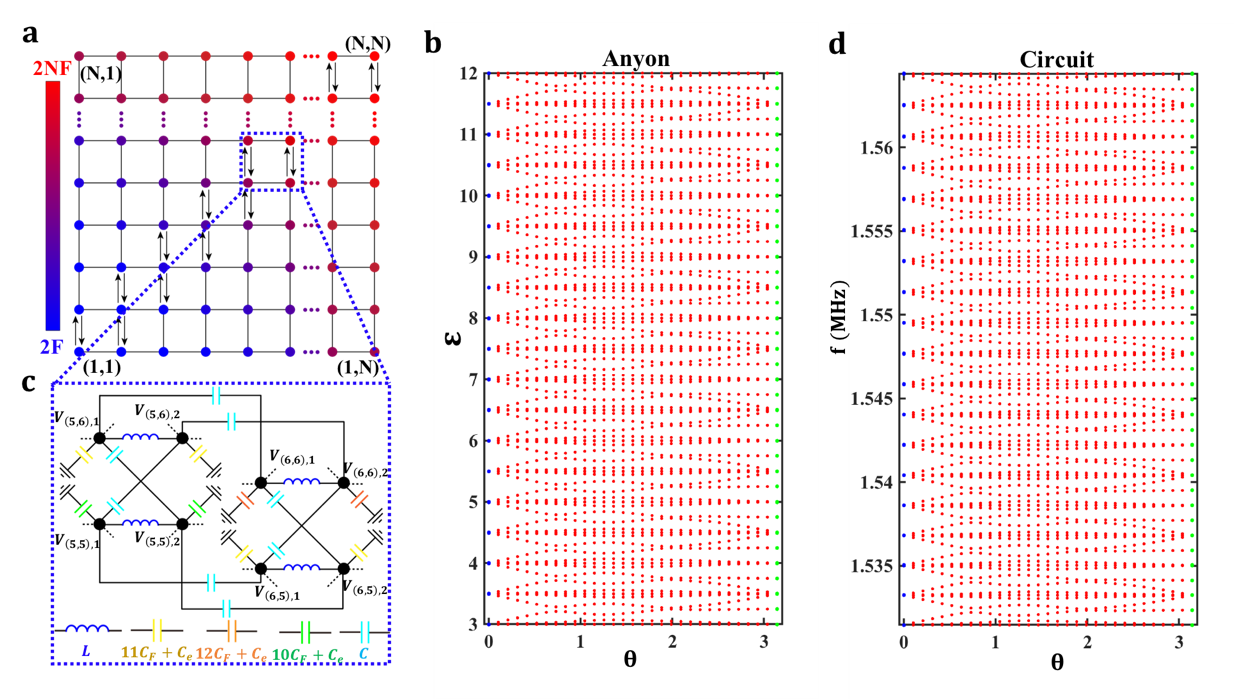 图1. 任意子-电路网络的设计方案和本征能谱。a和c:等效于一维-双体任意子模型的二维-单体紧束缚模型及电路设计。b和d:双体任意子和相应电路网络的本征能谱。