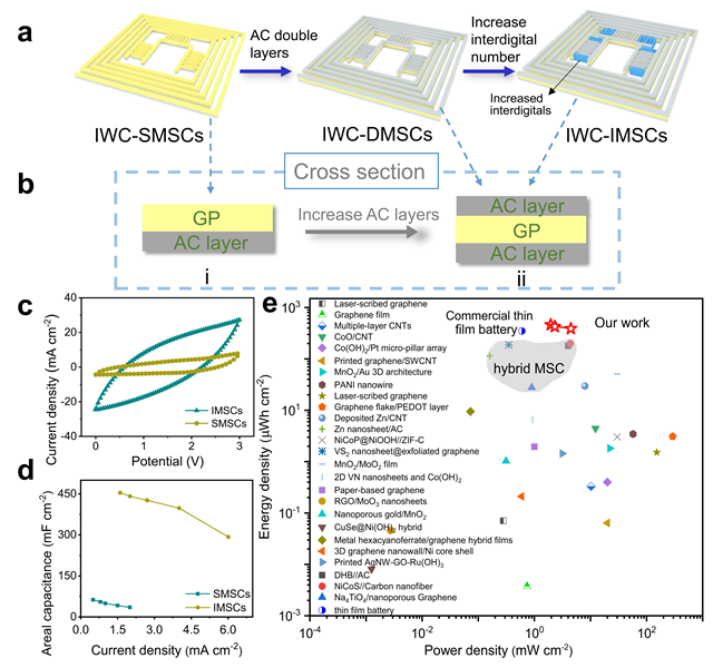 为实现非接触式充电和快速大功率供能的效果,该研究者研发了一种平面同轴结构的无缝集成的无线充电的微型超级电容器(IWC-MSCs)。该器件用活性炭涂覆的石墨纸经激光刻蚀而成,由三个指状组合型MSCs平行连接(芯片的中心,图2a蓝色部分)和具有一定圈数的无线充电线圈(芯片的外部,图2a桔色部分)组成。共享电极(图2a中的紫色线)用于连接MSC和WCC。有趣的是,研究者发现共享电极不仅可以充当线圈的导线从磁场中收集能量,而且还可用作三个并联的MSC的电极(图2a中的蓝线)。这主要是由于石墨纸(GP)具有低电阻、高电导率、出色的耐腐蚀性、低产热量以及较高的工作电压的优点,即使在密封环境中,与金属基线圈(如铜线圈)相比,石墨线圈作为IWC-MSC中的一个电极在电解质中工作时也更稳定。因此,研究者选择将石墨作为无线充电线圈和MSC电极一体化器件的制备原料。